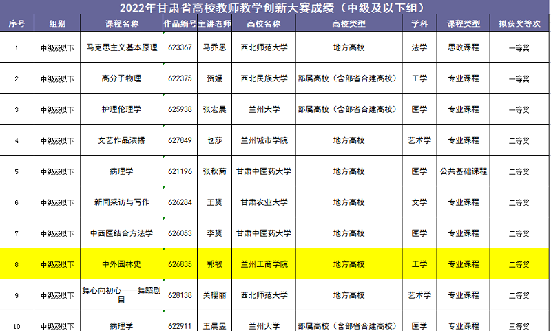 5月10日-11日,2022年甘肃省高校教师教学创新大赛现场评审在西北师范大学举行。经过激烈角逐,我院郭敏老师团队荣获省级二等奖,成绩处于同类院校前列,展现了我院教师良好的风貌。