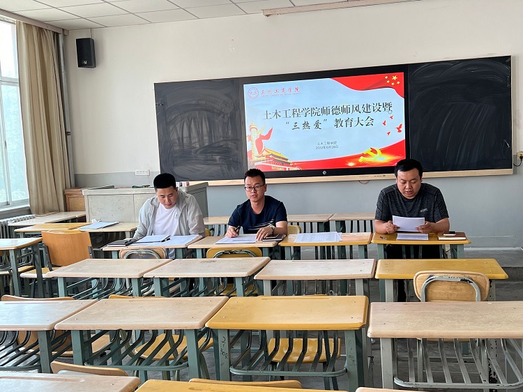 为全面贯彻习近平总书记关于教育的重要论述和全国教育大会精神,严格践行教育部《新时代高校教师职业行为十项准则》,围绕立德树人根本任务,教育引导教师热爱党的教育事业、热爱学校、热爱学生,自觉把党的教育方针贯彻到教育教学全过程,6月16日下午4:30,土木工程学院在2号楼310教室召开师德师风建设暨“三热爱”教育大会,土木工程学院领导班子及全体教工参加会议,会议由党总支副书记陈志昊主持。