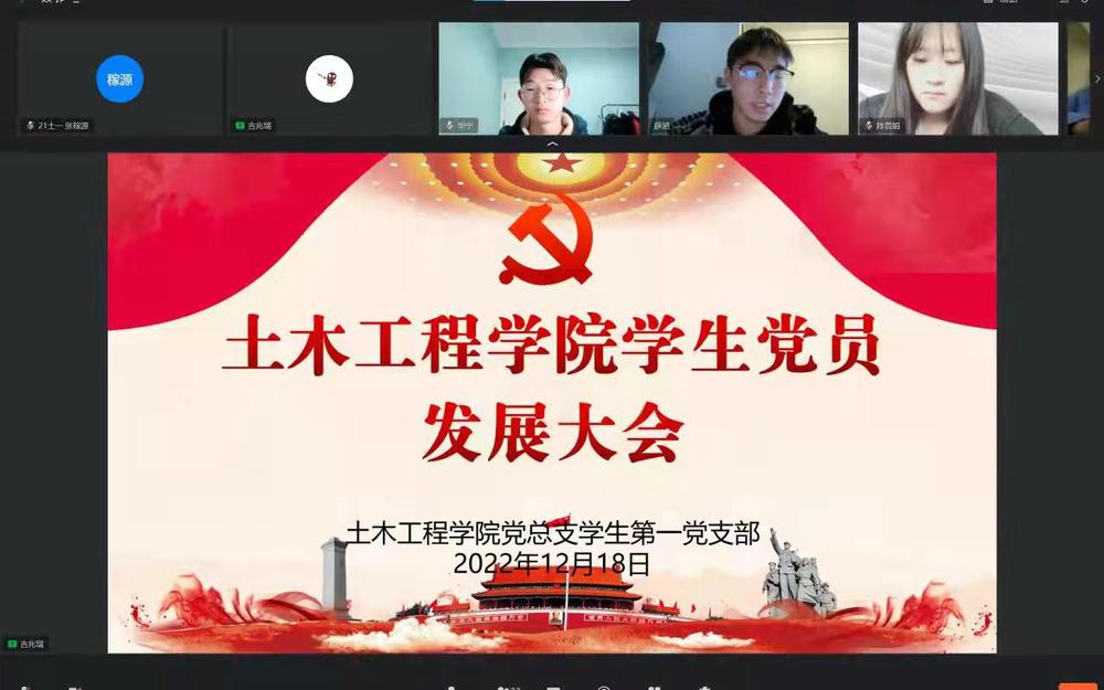 根据土木工程学院党总支发展党员工作计划,12月18日下午14:00,土木工程学院党总支学生第一党支部和第二党支部通过钉钉视频会议同步召开党员发展大会,支部书记及全体学生党员参加了会议,会议主要讨论了32名发展对象的发展问题。大会由各党支部副书记主持,
