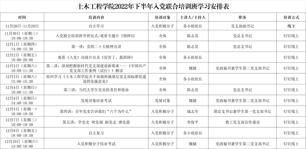 为深入学习贯彻习近平新时代中国特色社会主义思想和党的二十大精神,用党的创新理论武装师生头脑,切实提高党员发展质量。土木工程学院党总支于11月20日至12月10日举行入党联合培训班,通过线上学习和自主学习相结合的方式2022年下半年确定的入党积极分子和党员发展对象组织展开联合培训。
