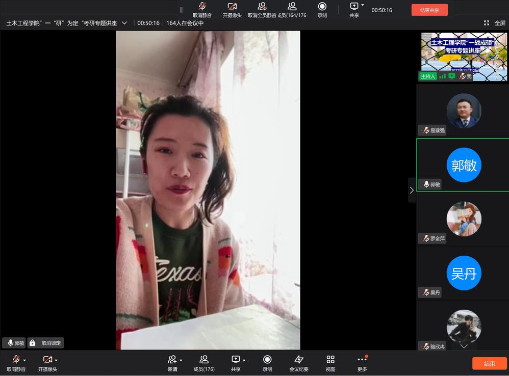 首先,往届考研优秀学子龚美玲、骆欣冉、罗金萍、吴丹四名同学从一名考研人的角度出发,分享了自己的备考经验和考研心路历程,尤其是疫情当下,如何静下心来全力备考提供了诸多有益指导,他们希望学弟学妹们能够以“不放弃,不服输”的精神集中精力备战考研,同时做到劳逸结合,学会阶段性地复盘和规划,相信大家一定能够成功上岸。