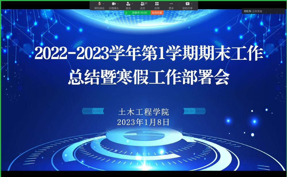 为做好本学期工作总结,进一步梳理工作思路,统筹安排下一阶段工作任务,1月8日下午3:00,土木工程学院通过钉钉召开2022-2023学年第一学期期末工作总结暨寒假工作部署会。学院领导班子及全体教职工参加会议,会议由学院院长陈继强主持。
