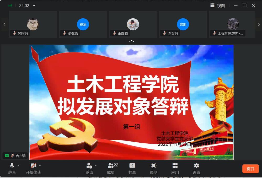 为进一步加强和改进发展学生党员工作,把牢学生党员发展的“入口关”,切实保证新发展党员质量,根据学校党委要求,近日,土木工程学院党总支通过线上方式举办2022年下半年拟发展对象公开答辩活动,学院党总支书记陈志昊、院长助理刘长东、李剑及部分教工党员担任答辩评委,由各班各职能部门推荐的37名学生作为拟发展对象参加了公开答辩。