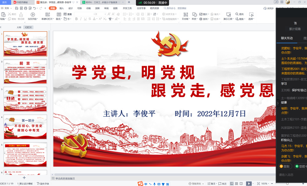 土木工程学院党总支书记陈志昊同志主持开班仪式,为大家宣讲党的二十大精神、开展《当代大学生党员的责任与使命》培训。党政秘书兼学生第二党支部书记魏婕同志进行深刻把握新时代党支部建设新要求——《中国共产党支部工作条例(试行)》解读。团总支书记兼学生第一党支部书记成志军同志开展《百年党史告诉我们“六个为什么”》专题培训。教工党支部宣传委员李俊平同志开展《学党史 明党规 跟党走 感恩党》培训。此外,各党小组组织大家观看《入党》动漫片、《榜样5》及《厉害了,我的国》,集中学习了《土木工程学院党总支关于加强所属基层党支部标准化建设的实施意见》兰工商土木党发〔2022〕12号文件。为提高学习效果,要求学员在学习的同时,认真撰写自学心得和学习笔记,并督促加强对学习强国和甘肃党建等学习平台的使用。