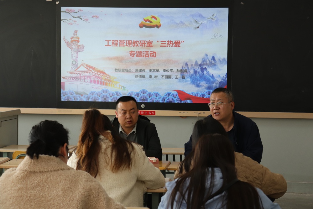 为推动学校“三热爱”教育各项工作走深走实,根据学院相关工作部署,3月23日下午16:20,工程管理教研室在2号教学楼308教室召开“三热爱”教育专题学习暨教学示范活动,教研室包干领导、学院党总支书记陈志昊及工程管理教研室全体教师参加,会议由工程管理教研室主任易建强主持。