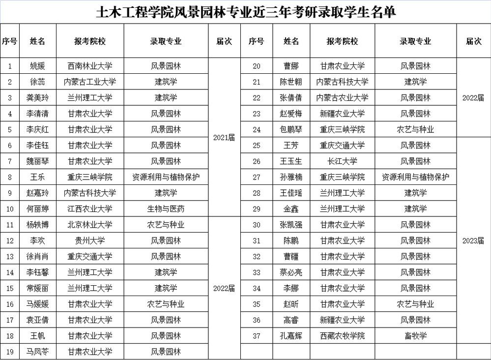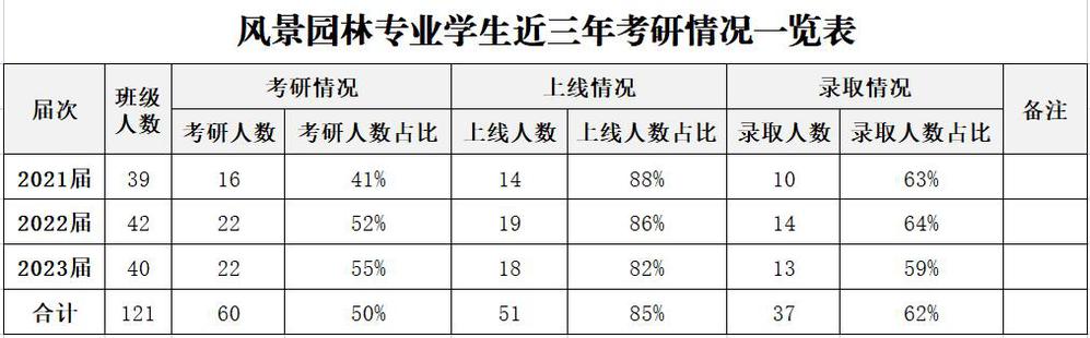 近三年,风景园林专业学生考研上线率及录取率保持稳步上升,考研学生人数始终保持在班级人数的50%以上,上线人数和录取人数逐年攀升,上线率始终保持在85%左右,近三年已累计有37名同学成功考取北京林业大学、贵州大学、西南林业大学、重庆交通大学和甘肃农业大学等高校硕士研究生,已经成为学校考研工作的一张靓丽名片。