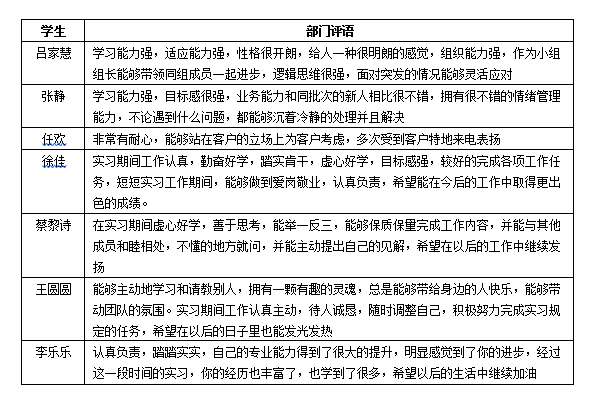 学生实习期间,各项数据指标及工作表现优异,表现出了较高的职业性,能够胜任岗位要求。涌现出以下7位优秀的实习生。特此表扬。