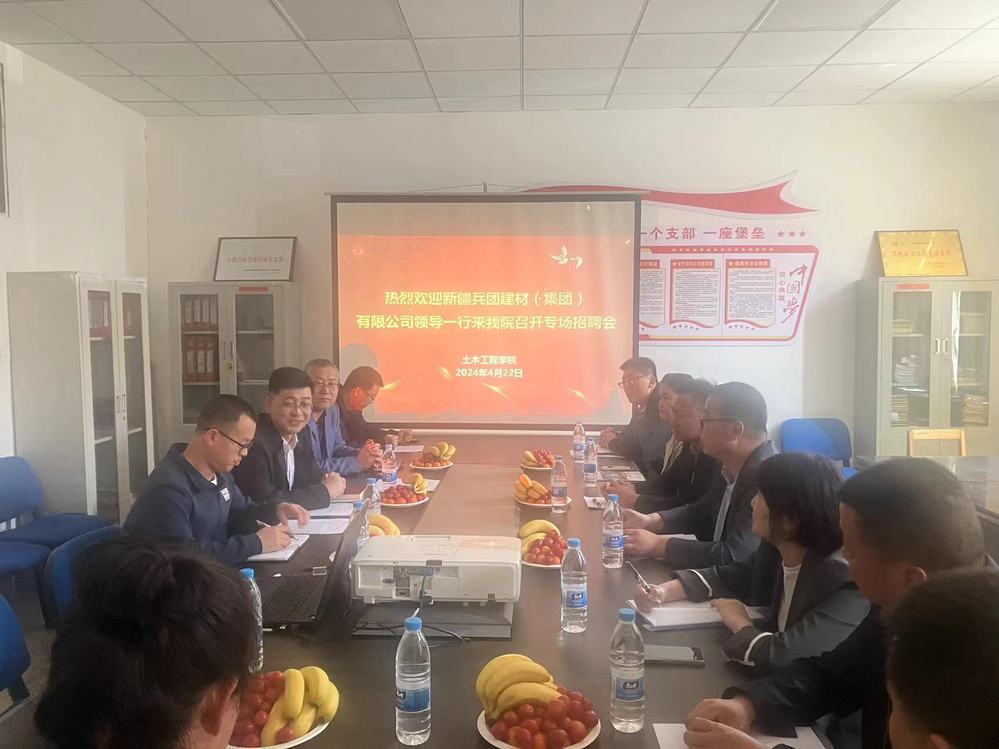 为加强校企合作育人机制,拓宽毕业生就业渠道,实现毕业生高质量就业,经过前期的对接,土木工程学院邀请到新疆兵团建材(集团)有限公司及三家全资子公司领导一行9人于4月22日来校洽谈校企合作事宜。