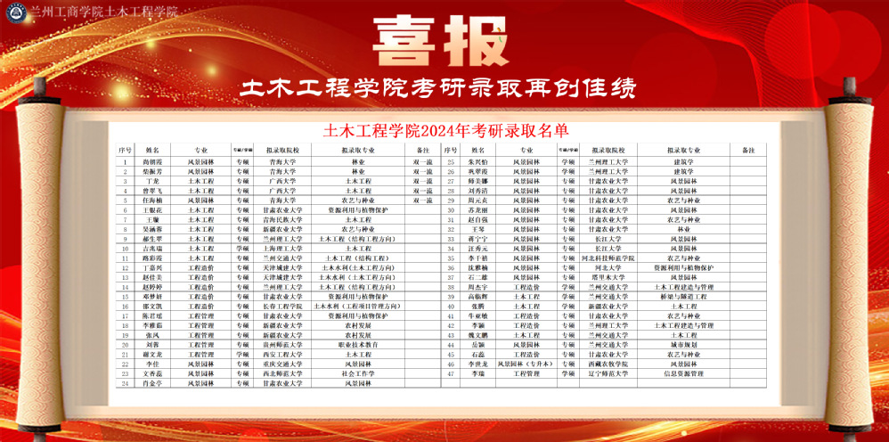 今年考研升学可喜成绩的取得,得益于学校的关心与支持、指导与帮助,同时,也凝聚了土木工程学院全体教职工和广大毕业生的心血和汗水。学院将紧紧围绕学校重点工作,以人才培养为根本任务,持续深挖专业特色,注重考研精神传承,着力打造风景园林特色考研专业,不断提高本科教育教学质量,为推动学校、学院高质量发展做出更大贡献。