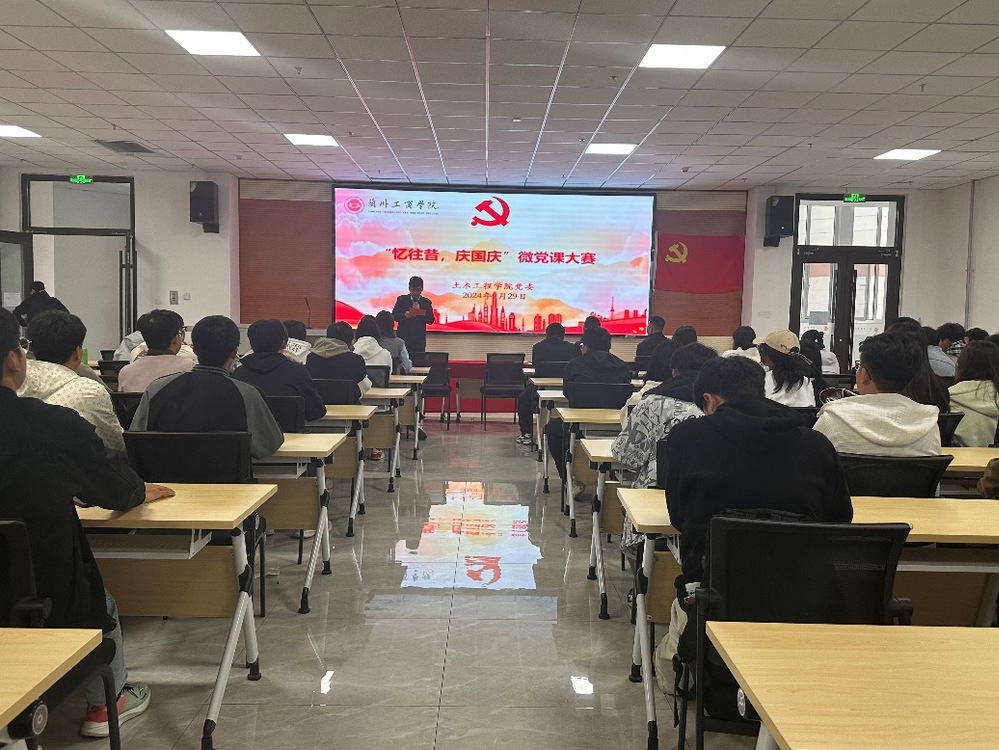 为庆祝中华人民共和国成立75周年,深入学习贯彻习近平新时代中国特色社会主义思想和党的二十届三中全会精神,进一步弘扬爱国主义精神,激发爱党爱国热情,提高学生党员思想政治素养,9月29日下午,土木工程学院在综合教学楼C501举办“忆往昔、庆国庆”微党课大赛。学院党委书记彭勇、行政院长助理李剑、各党支部书记、党员及入党积极分子代表共计150余人参加了本次活动。