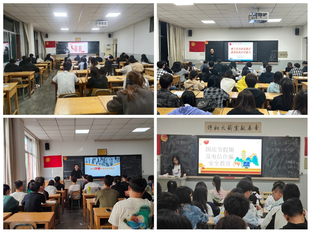 安全主题班会上,辅导员老师围绕网络安全、交通安全、消防安全、财产安全、预防电信诈骗等安全教育主题展开教育活动。要求学生严格请销假制度,严禁赌博、酗酒、晚归及夜不归宿,全面落实节假日外出报备,严格执行学校的规章制度及作息时间;同时,就网络安全依据相关法律法规做了教育引导,教育学生文明上网,不在社交网络平台发布和传播违反国家法律、影响国家安全稳定等信息;在预防电信诈骗教育时,通过真实案例提醒学生防范各类诈骗信息,谨防上当受骗,要求同学们增强纪律意识,树立安全防范意识,切实做好防火、防盗、防骗等安全工作。此外,主题班会还强调了节假日期间的学生宿舍安全、交通安全等要求及其他安全稳定事项。