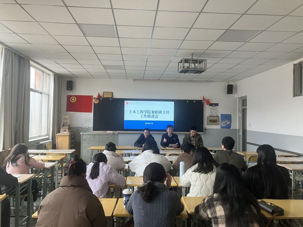 为进一步贯彻落实学校关于兼职班主任工作相关文件精神,切实发挥专任教师对学生学业方面的指导作用,强化育人合力,土木工程学院于11月21日在善问楼310教室召开兼职班主任工作推进会,学院相关领导、全体兼职班主任参加,会议由行政院长助理李剑主持。