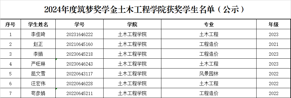 土木工程学院2024年度筑梦奖学金获奖学生名单(公示)