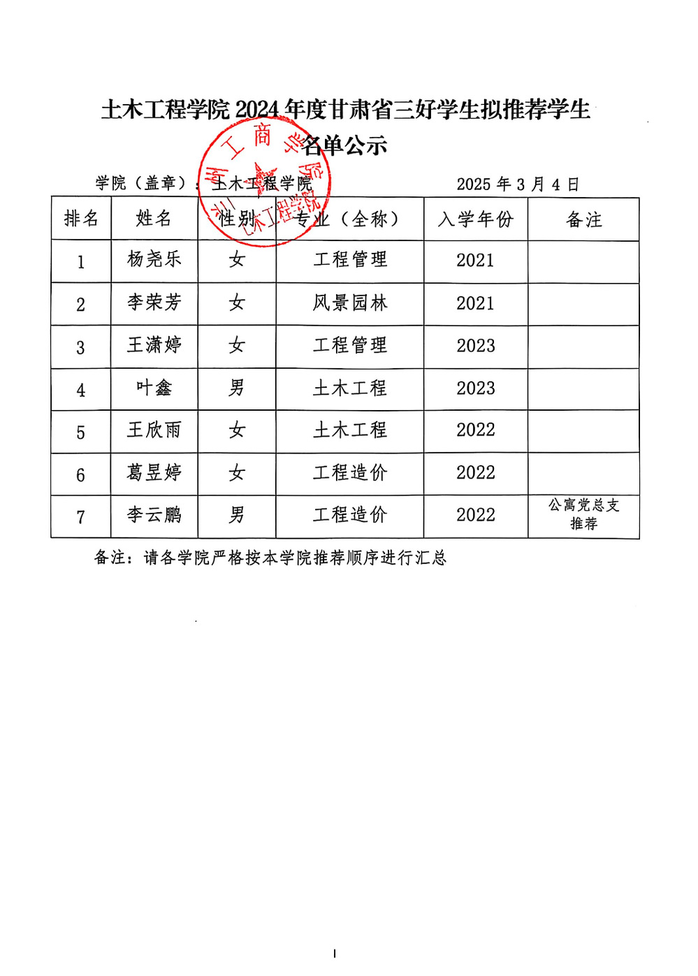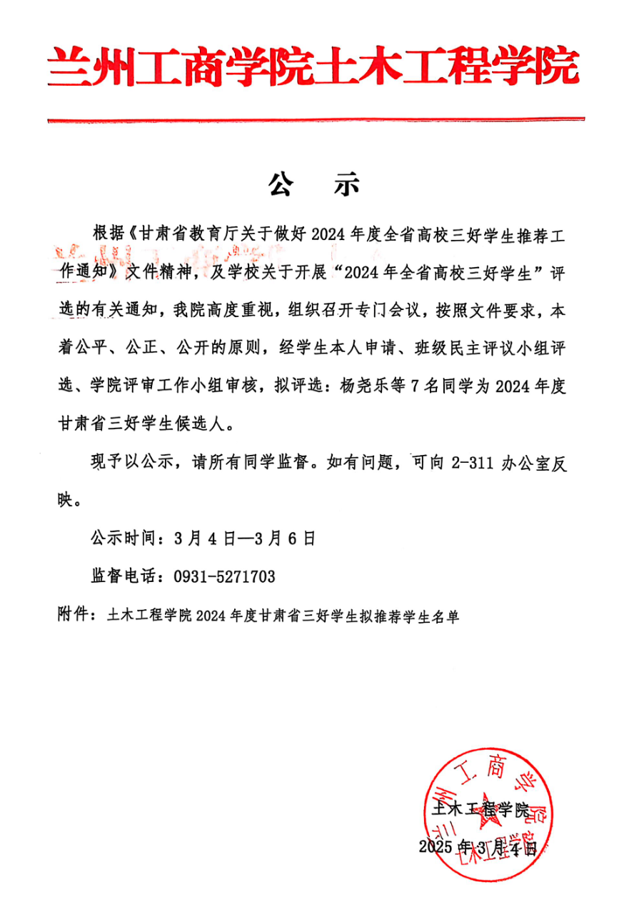 土木工程学院2024年度甘肃省三好学生拟推荐学生名单(公示)