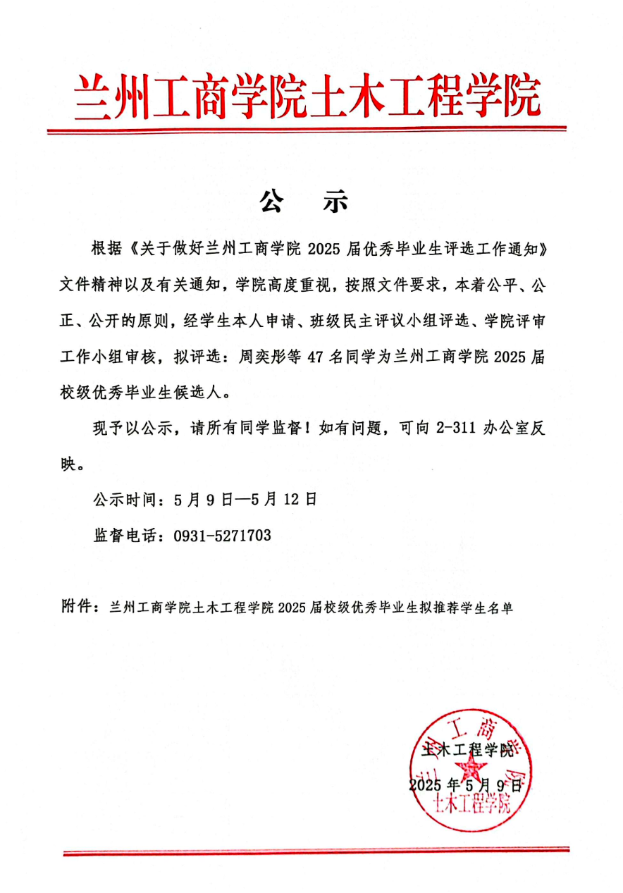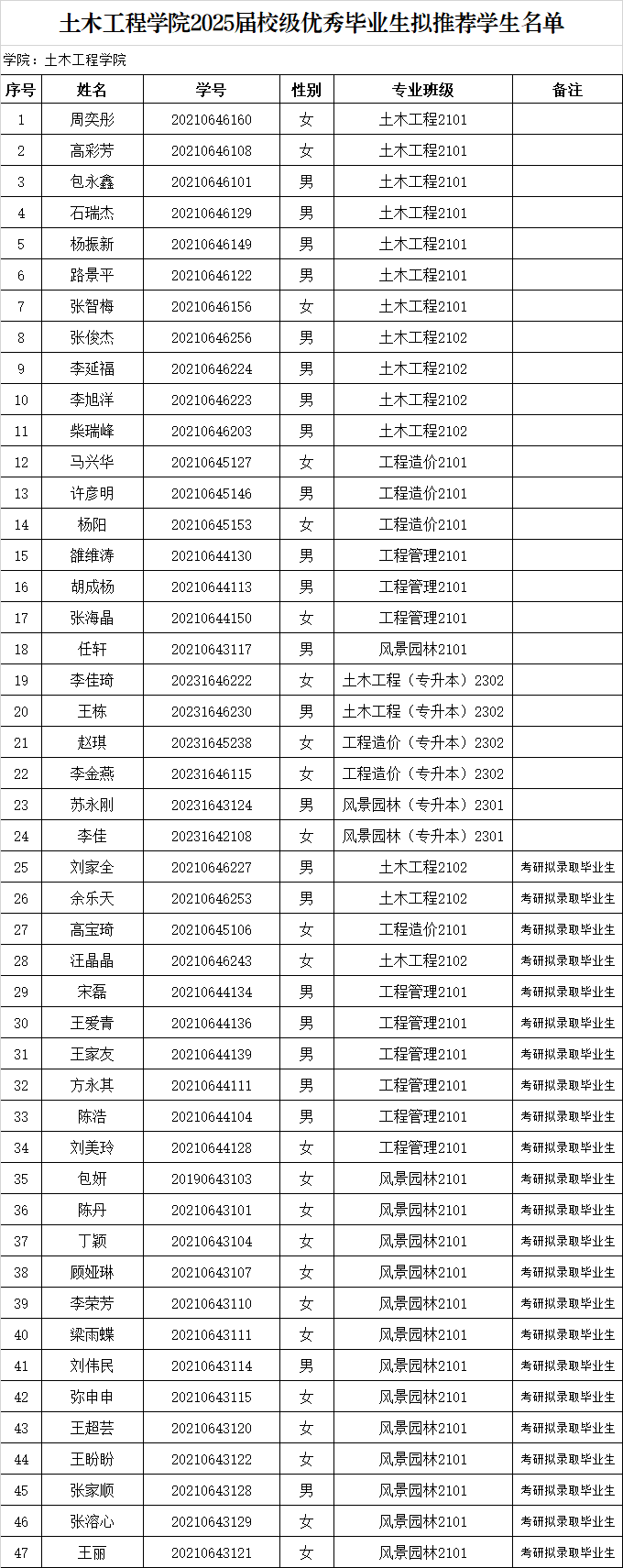 土木工程学院2025届校级优秀毕业生拟推荐学生名单(公示)