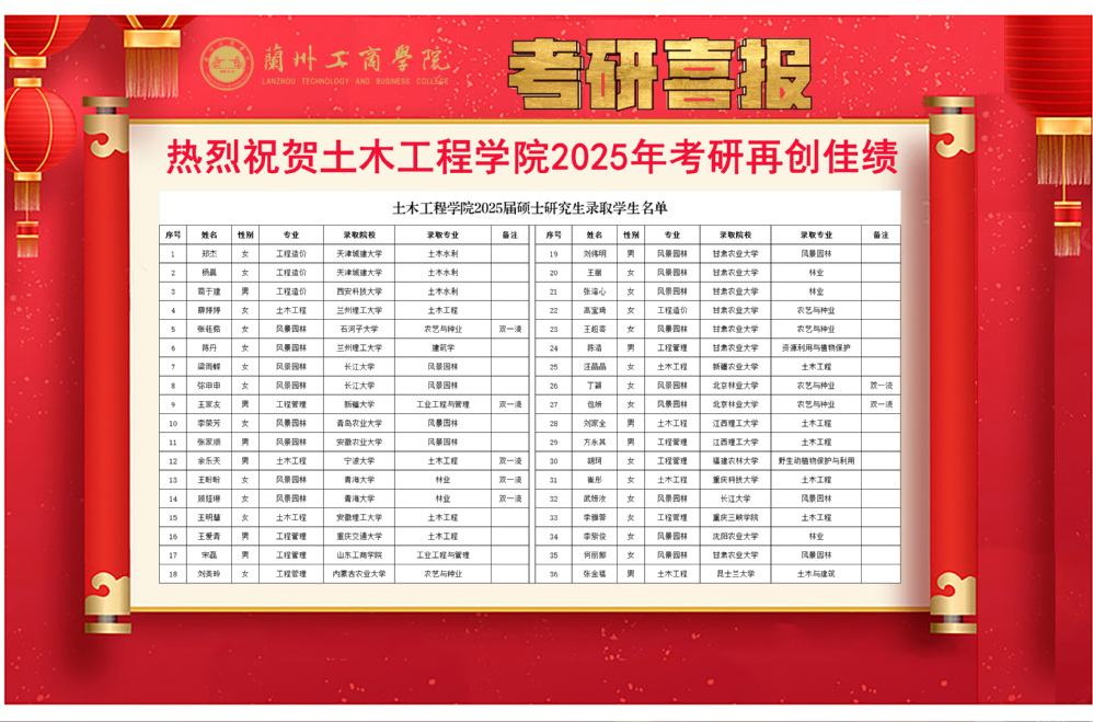 春风化雨,桃李竞芳。随着2025年全国硕士研究生录取全面结束,土木工程学院考研学子脚踏实地、砥砺前行,共有36名学生成功上岸,继续深造,其中35名学生被宁波大学、北京林业大学、青海大学、新疆大学、石河子大学等高校录取,1人出国留学深造,考研工作再创佳绩!