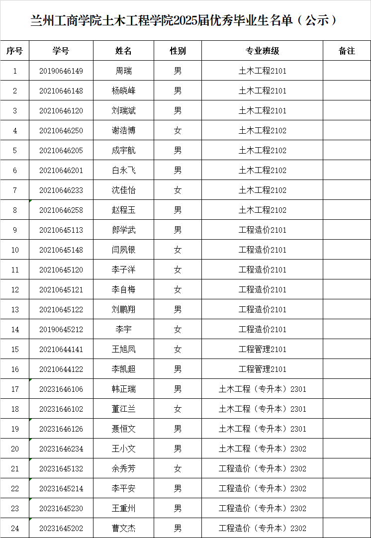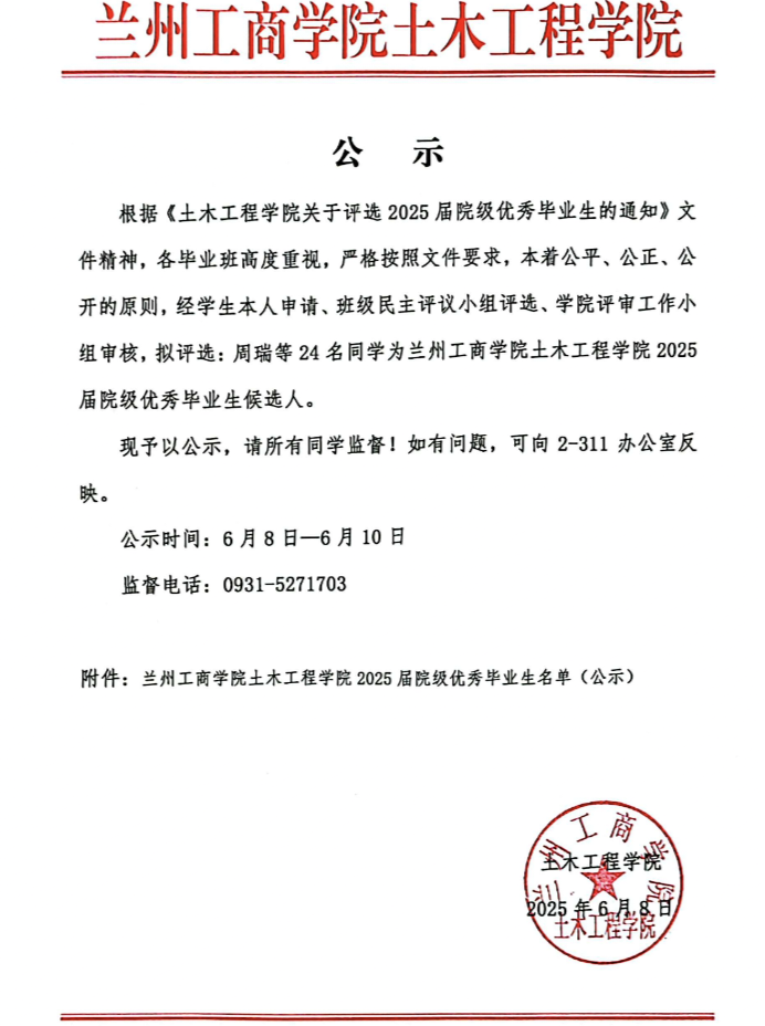 土木工程学院2025届院级优秀毕业生拟评选学生名单(公示)