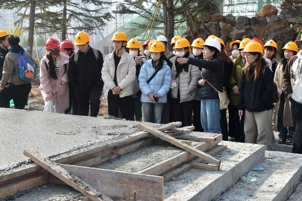在学院专业教师与现场工程师的联合指导下,学生系统学习了钢筋混凝土工程、内外墙抹灰、保温层铺设、饰面砖铺贴以及防水工程的施工方法。同时,实地观摩了钢筋绑扎、模板支护与混凝土浇筑等关键工序。现场工程师围绕混凝土振捣与养护等核心要点进行了详细讲解,使学生对施工质量控制与现场技术管理有了更加具象的理解。