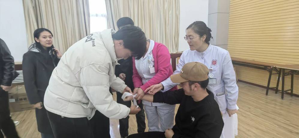 前期筹备阶段,学院积极对接医院,成功借调心肺复苏模拟人、纱布、绷带等专业器材,并合理划分理论讲解区与实操练习区,为培训有序开展提供保障。培训伊始,急救人员聚焦心肺复苏与伤口包扎两大核心内容,结合图文,详细讲解判断意识、胸外按压、人工呼吸的操作步骤,以及环形包扎、螺旋形包扎的基础要点,确保参训人员领会学习基础急救知识。
