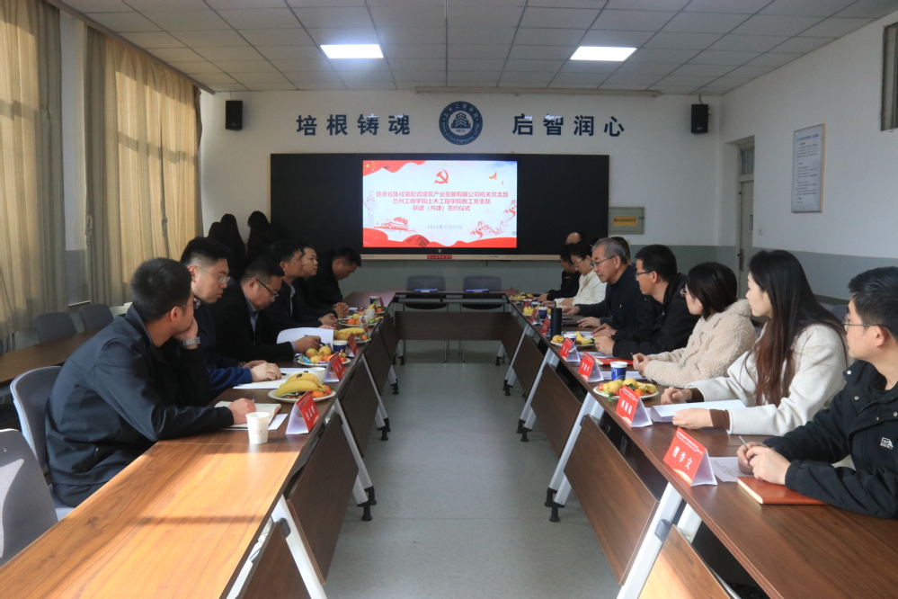 签约仪式上,集成装配公司纪委书记、工会主席温鸿武首先介绍了企业深耕装配式建筑领域的发展历程,重点分享了党建引领技术创新、赋能产业升级的实践成果,并就行业人才需求、关键技术攻关等提出合作期待。学院院长武建军教授详细介绍了学院办学特色、党建工作开展情况、相关专业优势、人才培养成果,表达在党建引领下,深化校企合作、推动产学研发展的合作愿景。随后,双方党支部代表签署《支部共建合作协议》,计划通过组织联建、产教实训、人才联育等形式,在实习实训基地建设、学生就业创业、联合科研攻关等领域开展深度合作。在座谈环节,双方就建立常态化交流机制、人才联合培养新模式、科研项目联合申报等内容达成共识。