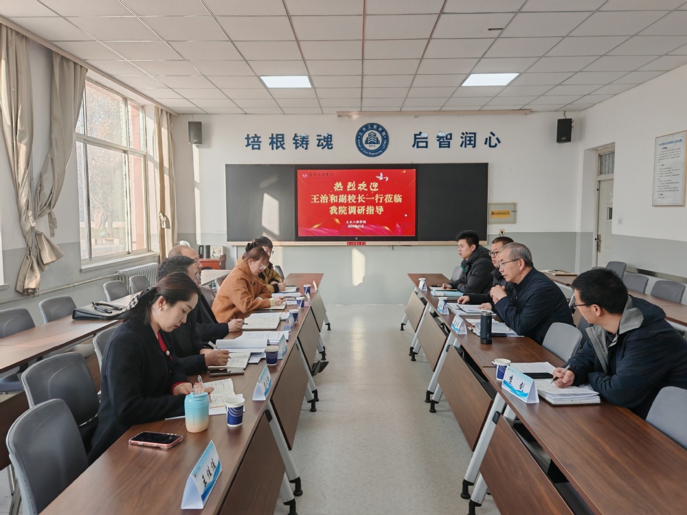 12月1日上午,副校长兼教务处处长王治和教授一行莅临我院,对实习实践开展、专业建设优化等工作开展专项调研指导。学院领导班子参加调研座谈。