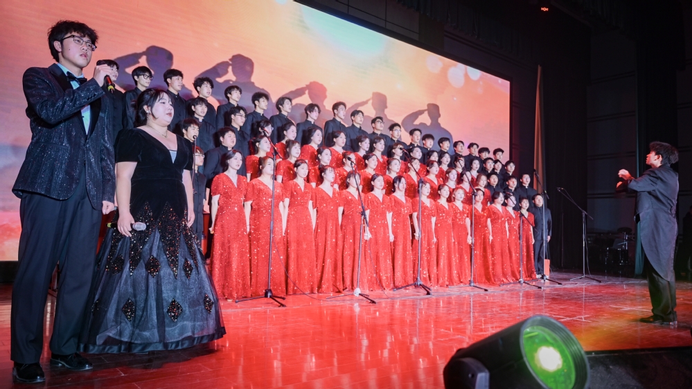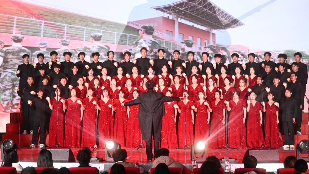 舞台上,同学们精神饱满、队列整齐,以铿锵有力的演唱演绎《打靶归来》,将战士们凯旋的喜悦与豪迈展现得淋漓尽致;随后一曲《保卫黄河》,旋律激昂澎湃、歌声气势恢弘,唱出了中华民族抵御外敌、保家卫国的决心与勇气,深深感染了现场每一位观众和评委,赢得阵阵掌声与喝彩。