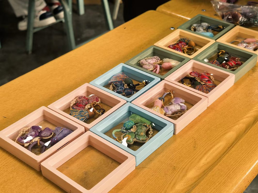 另一场“宋锦非遗手工体验”活动则带领同学们深入领略了传统织锦技艺之美。同学们通过宣传短片和老师讲解,了解了宋锦的历史与纹样内涵,亲手体验了宋锦作品的制作过程。大家将精选的宋锦面料细心包裹、固定,逐步转化为一件件精美的挂件、胸针等小物件。活动现场互动频繁,大家在动手实践中沉浸式感受非遗文化的深厚底蕴。
