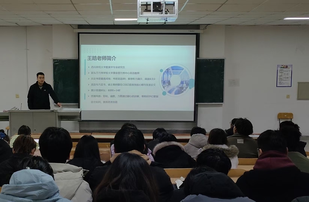 动员会特邀新东方考研资深规划师王皓老师担任主讲,学院辅导员李新虎老师主持开场并介绍嘉宾。李老师表示,王皓老师深耕考研规划领域多年,经验丰富,其专业指导将为同学们提供宝贵的专业、院校选择参考。