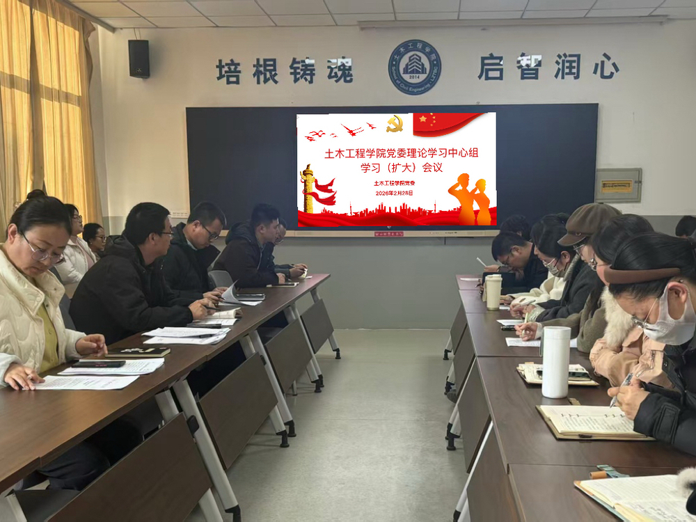 为持续深化理论武装,筑牢思想根基,切实把学习成果转化为推动学院发展的实际行动,2月28日下午,土木工程学院在善问楼106会议室召开2026年度第二次党委理论学习中心组学习(扩大)会议。学院全体领导、全体教工党员参加会议,会议由学院党委副书记李剑主持。