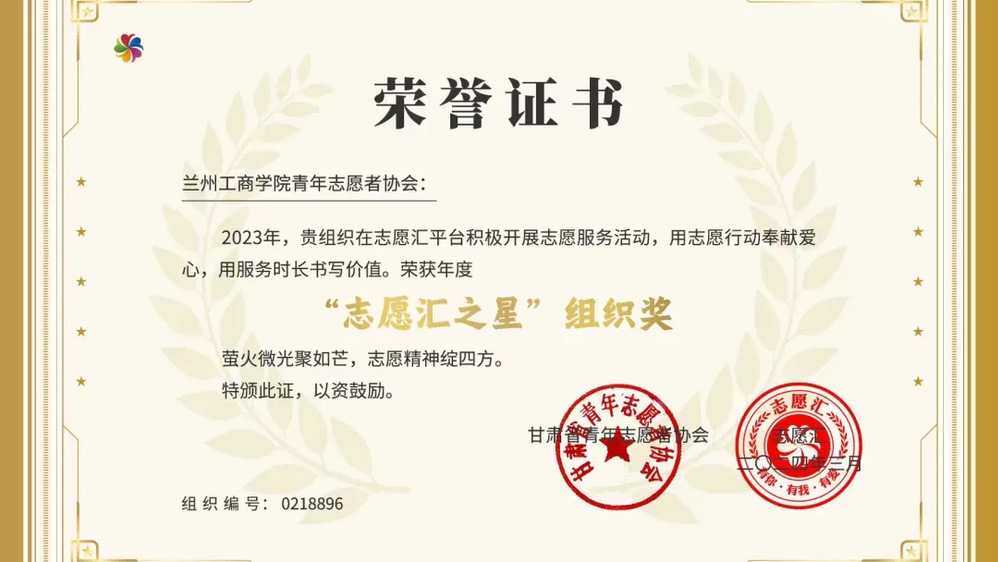 兰州工商学院荣获“志愿汇之星”年度组织奖。