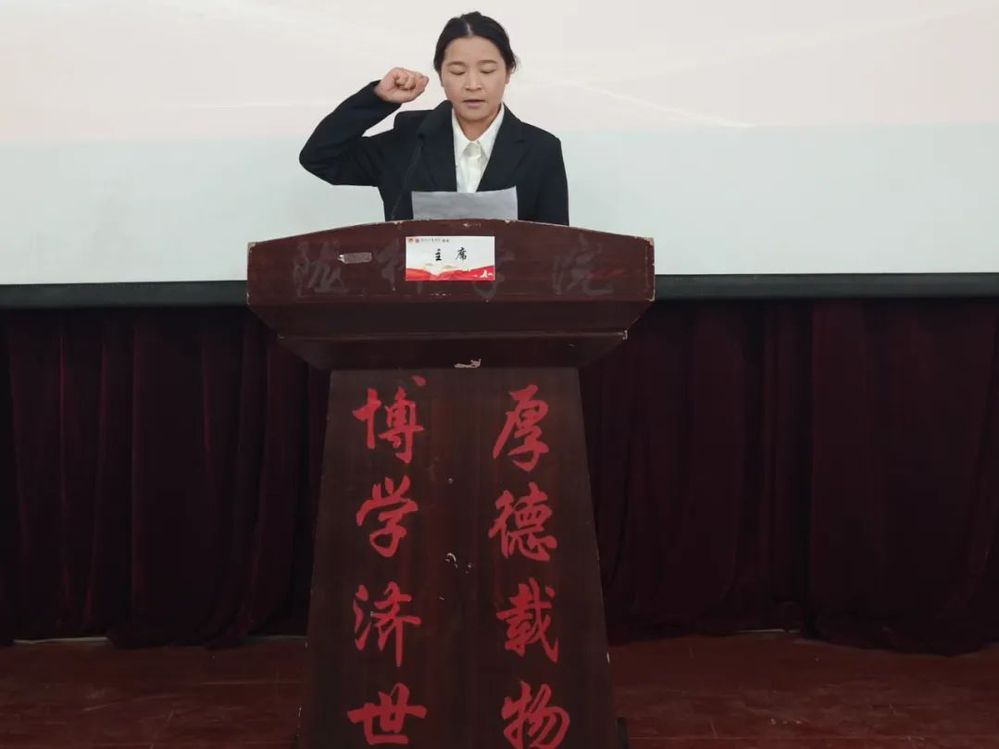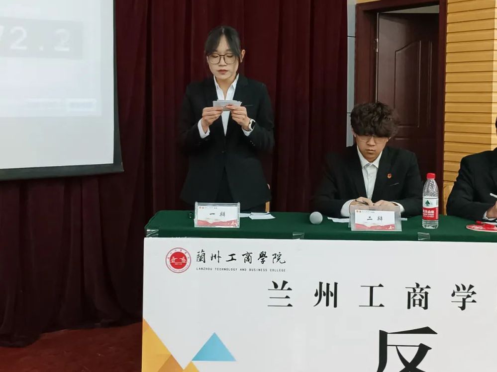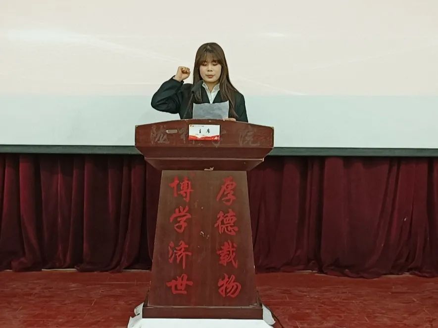 作为辩论赛代表宣誓之人,她们承载的不仅是个人荣誉,更是对赛事公平竞争精神的执着坚守。她们以清晰且坚定的言辞,向所有人传达对公平竞争矢志不渝的信念,每字每句如洪钟般敲击在参与者心间,将公平竞争理念深深烙印;而那饱满昂扬的精神状态,淋漓尽致地彰显出辩手独有的风度与担当,这风度是对对手的尊重,这担当是对真理的追求。赵云芳同学作为评委组代表,以沉稳专业的姿态宣誓发言,承诺以公正无私的态度、专业敏锐的视角为赛事公平公正保驾护航;杨梦丹同学作为参赛选手代表,带着青春朝气与自信,在宣誓中表达将以积极向上的态度全身心投入比赛,充分挖掘发挥自身能力,力求在赛场上绽放光芒,完美展现兰工商学子朝气蓬勃、积极进取的良好风貌,为这场即将拉开帷幕的辩论赛奠定坚实基础,也让所有人对接下来的思辩盛宴满怀期待。