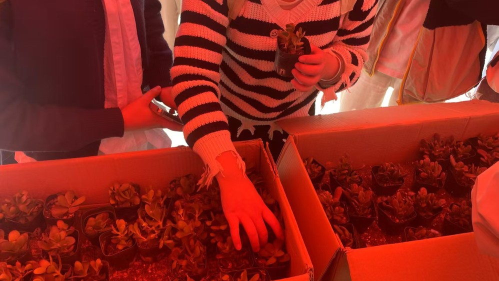同学们有序排队登记,领取专属绿植。鼓励同学们从养护绿植开始,培养低碳生活好习惯。