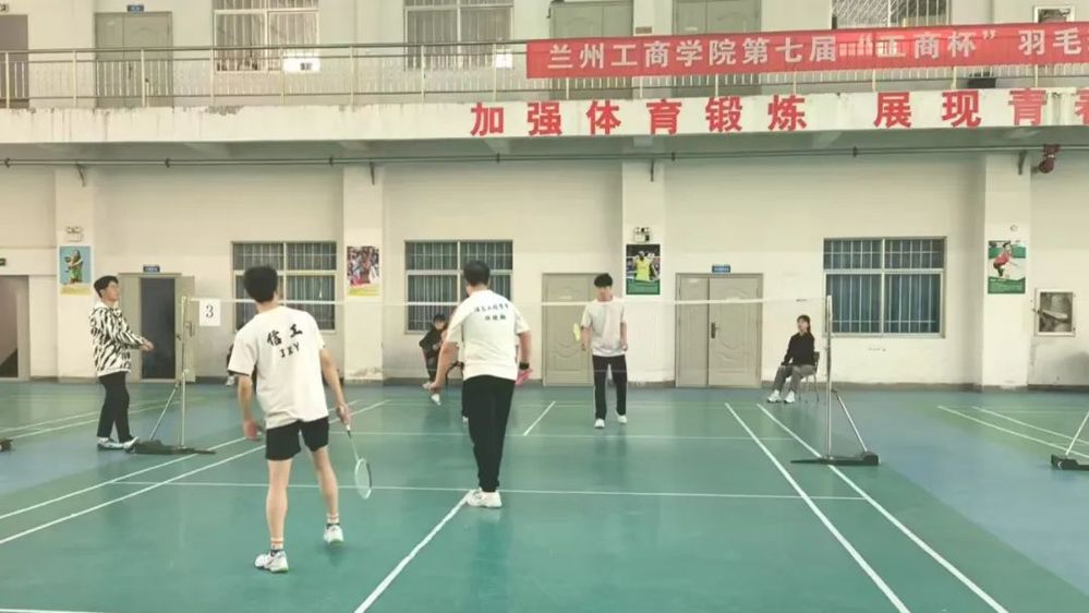 在兰州工商学院的室内体育馆里,第七届“工商杯”羽毛球赛正如火如荼地进行着。这里,是青春与激情碰撞的舞台,是汗水与荣耀交织的战场。走进场馆,便能感受到那股热烈的氛围。绿色的球场上,白色的界线清晰分明,像是划分出了一片专属于青春的领地。场边的墙壁上,“加强体育锻炼 展现青春风采”的红色标语格外醒目,仿佛在不断激励着每一位参赛选手。