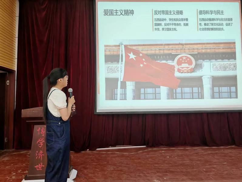 随后,学生会工作人员沈祎歌通过讲解 PPT,从历史渊源到时代价值,全方位解读五四精神与新时代使命的紧密联系。她生动阐述道,学习五四精神不仅是对历史的致敬,更是新时代青年锤炼品格、增长本领的必然要求。青年学子应从五四精神中汲取养分,在时代浪潮中找准自身定位,以实际行动践行使命担当,让青春在为祖国、为人民的奉献中焕发出绚丽光彩。