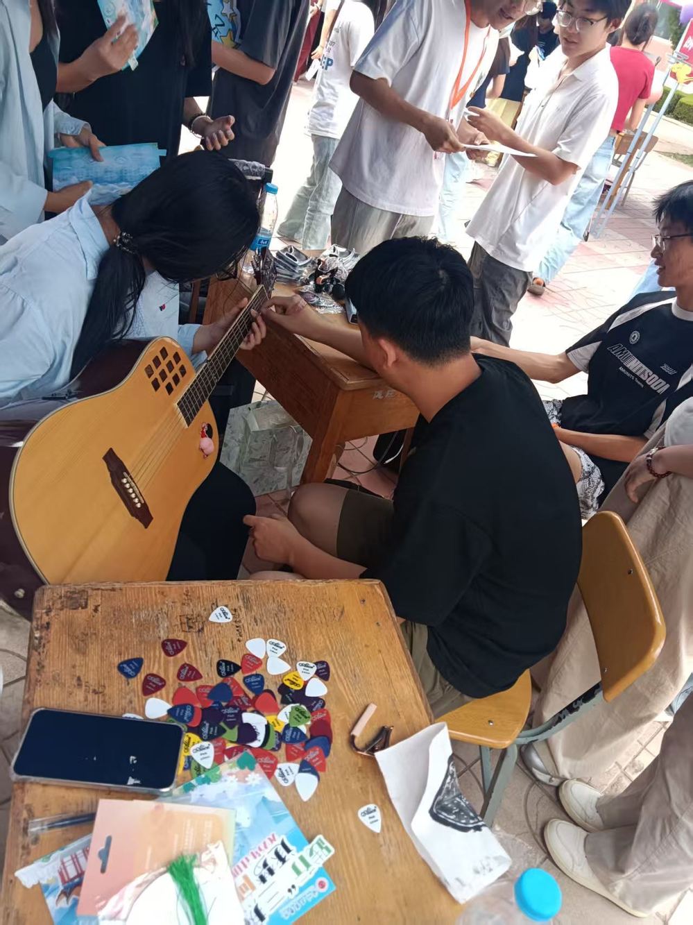 “专业技能赋能”区域热闹非凡,计算机协会的AI换脸和体感游戏吸引了大批科技爱好者,英语社的词汇对战和故事拼图让语言学习充满乐趣。从飞盘社的夜光竞技到跑步社的荧光夜跑,从棋类协会的智慧对弈到各类体育项目的趣味挑战,现场欢声笑语不断。艺术类社团同样精彩纷呈,书画协会的毛笔听写、吉他社的教学互动,以及跆拳道社的力量展示,都让同学们流连忘返。
