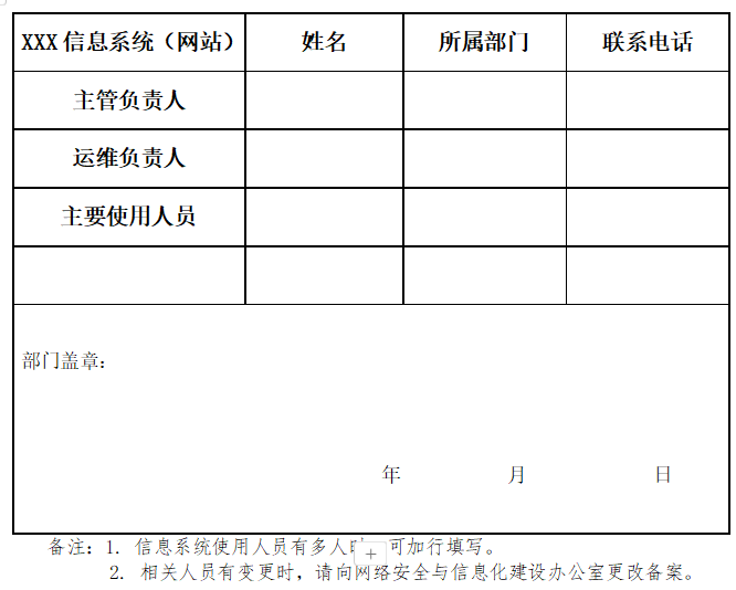 填表说明: 1、此表一式两份,备案单位下载、填写、打印后并签字加盖公章送交网络安全与信息化建设办公室,一份网络安全与信息化建设办公室备案,一份用户单位留存。 2、网站、信息系统负责人必须是部门一把手,管理员必须是教职工,运行状态如勾选“注销关停”需管理员或负责人签字确认。 3.等保定级依照国家等级保护政策规定,确定相应安全保护级别。 | ||||||