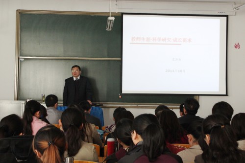2011年10月18日下午,应我系邀请,兰州大学外国语学院院长袁洪庚教授在实验楼213做了题为“教师生涯、成长需求、科学研究”的学术报告。报告由我系主任王丽涛主持。外语系全体教师参加了此次学术报告会。