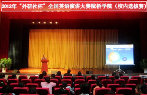 为了有力推动我院英语教学,创新教学内容,展现教学水平,促进教师发展,同时给学生创造一个激励外语学习、展示综合能力、选拔优秀人才的平台。9月27日下午,由院团委、外国语言文学系承办的2012年“外研社杯”全国英语演讲大赛陇桥学院(校内选拔赛)在学术报告厅隆重举行。