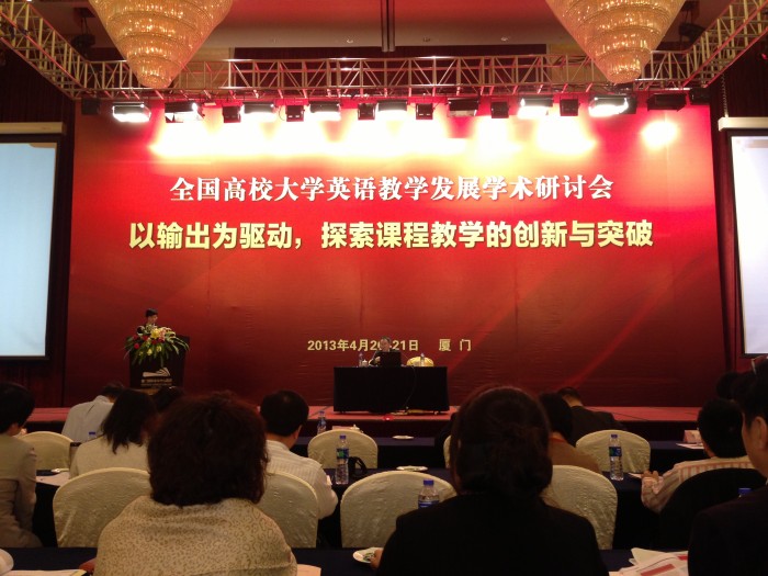教育部高等学校大学外语教学指导委员会、中国外语教育研究中心、外语教学与研究出版社于2013年4月20日-21日在厦门联合举办了“全国高校大学英语教学发展学术研讨会”。我系杨彦文老师参加了此次会议。此次研讨会主题为“以输出为驱动,探索课程教学的创新与突破”。文秋芳、王守仁等国内专家在此次会议上做了专题讲座。