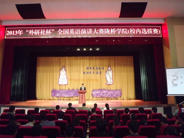 9月29日下午4:30,兰州商学院陇桥学院“外研社杯”英语演讲比赛(校内选拔赛)在学术报告厅隆重举行。本次活动由兰州商学院院团委、外国语言文学系主办,外国语言文学系团总支、学生会分会承办。担任本次比赛评委的是外国语言文学系教学副主任权志成、外国语言文学系教学副主任杨彦文、外教Louis老师、李晓红老师及阮晓静老师。出席此次活动的嘉宾有陇桥学院副院长杨培权、教务处处长高军、学术与科研交流处长丁敏、学院办公室副主任袁东东、院团委副书记孙世强及各系党总支书记、党总支副书记、团总支书记和学生代表800余人。