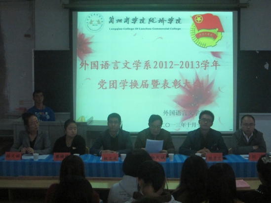 2013年10月15日下午17:00我系在善问楼115教室隆重举行了外国语言文学系2012—2013年度党团学换届暨表彰大会。出席本次会议的嘉宾有:外国语言文学系党总支书记杨天斌,教学副主任杨彦文、权志成,刘涛、蔡婧婧老师,会议由团总支书记杨文娟主持。