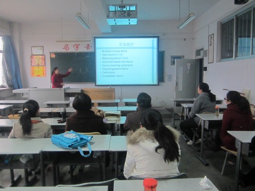 会上,詹秀伟老师结合英语测试与评价课程,从测试的题目类型、信度、效度、区分度、成绩分析等方面对大家进行了细致的讲解。会议最后,大家就以往出题及试卷分析的经历进行了交流分享。