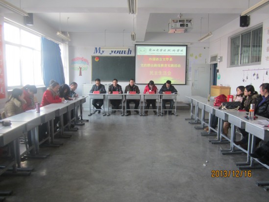 按照学院党委的群众路线教育实践活动总体安排,12月16日下午,外国语言文学系领导班子专题民主生活会在4号楼406教室召开。院长助理燕宏,系主任王丽涛,系党总支书记杨天斌,教学副主任权志成、杨彦文和全系教职员工参加了会议。系党总支书记杨天斌主持会议。