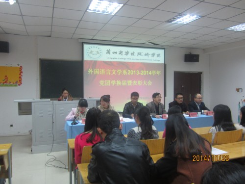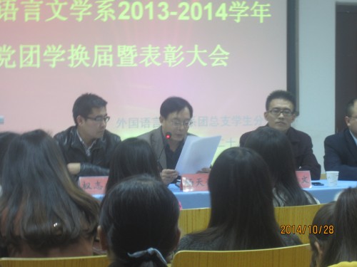 2014年10月28日下午16:30,外国语言文学系在学术报告厅204教室举行了“2013--2014学年党团学换届暨表彰大会”,系主任权志诚、系党总支书记杨天斌、教学副主任杨彦文、全体辅导员、团学干部及2014级新生参加了本次会议。大会由团总支书记蔡婧婧主持。