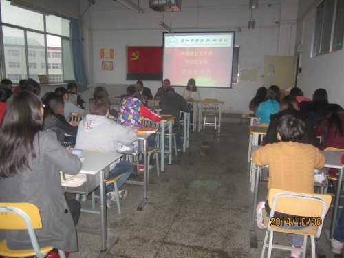 2014年10月30日下午,外国语言文学系党总支学生第一党支部和学生第二党支部民主生活会分别在四号教学楼609教室和607教室举行。参加会议的有外国语言文学系党总支书记杨天斌,学生第一党支部书记刘涛,学生第二党支部书记蔡婧婧,各学生支部负责人和全体学生党员。会议分别由刘涛老师、蔡婧婧老师主持。