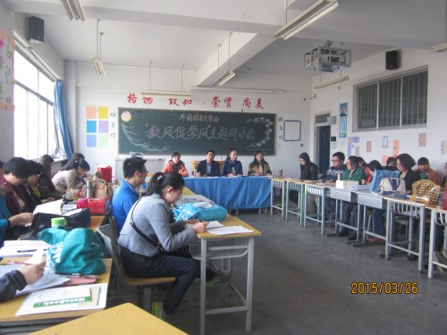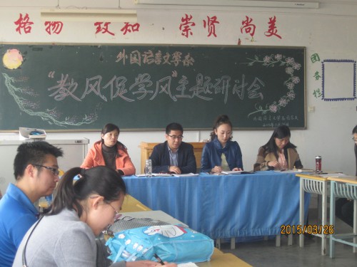 外国语言文学系于2015年3月26日下午在明辨楼409教室召开“教风促学风”主题研讨会。我系主任权志成、党总支副书记郭思莹、副主任王丽涛、主任助理韩世霞及我系全体教师参加了本次研讨会。会议由系主任权志成主持。