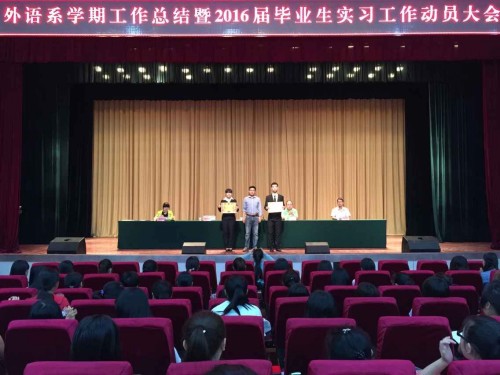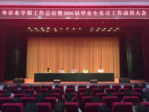 2015年7月8日下午16:30外国语言文学系在学术报告厅组织召开了外国语言文学系期末工作总结暨2016届毕业生实习工作动员大会。出席本次大会的领导有:外国语言文学系教学主任权志成、党总支副书记郭思莹、团总支书记蔡婧婧、辅导员老师刘涛、田煜。外语系全体同学参加了此次大会。