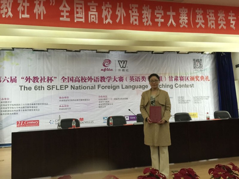 2015年10月10日-11日,第六届“外教社杯”全国高校外语教学大赛(英语类专业组)甘肃赛区复赛在甘肃农业大学举行。本次大赛由教育部高等学校外语专业教学指导委员会、教育部高等学校大学外语教学指导委员会、甘肃省教育厅、上海外语教育出版社共同主办,甘肃农业大学承办,分为英语专业组和商务英语专业组两个组别,共有来自兰州大学、西北师范大学、兰州理工大学、兰州交通大学、西北民族大学、兰州财经大学、兰州商学院陇桥学院、兰州交通大学博文学院等19所高校的37名选手参加比赛。经过激烈角逐,我院外国语言文学系青年教师陆文获得商务英语专业组优胜奖。