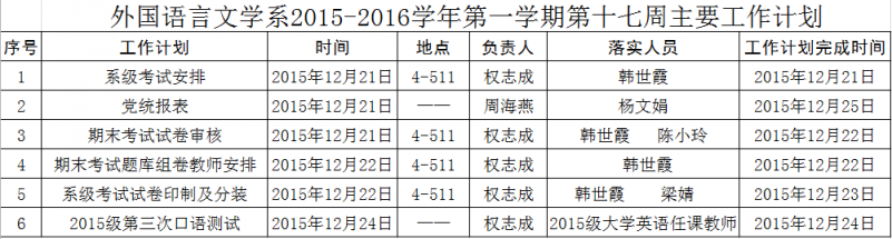 外国语言文学系2015-2016学年第一学期第十七周主要工作计划