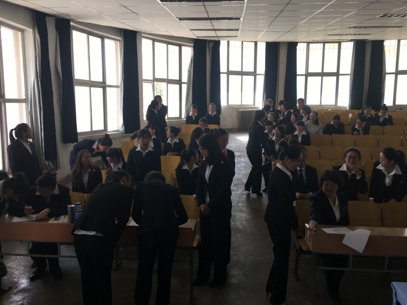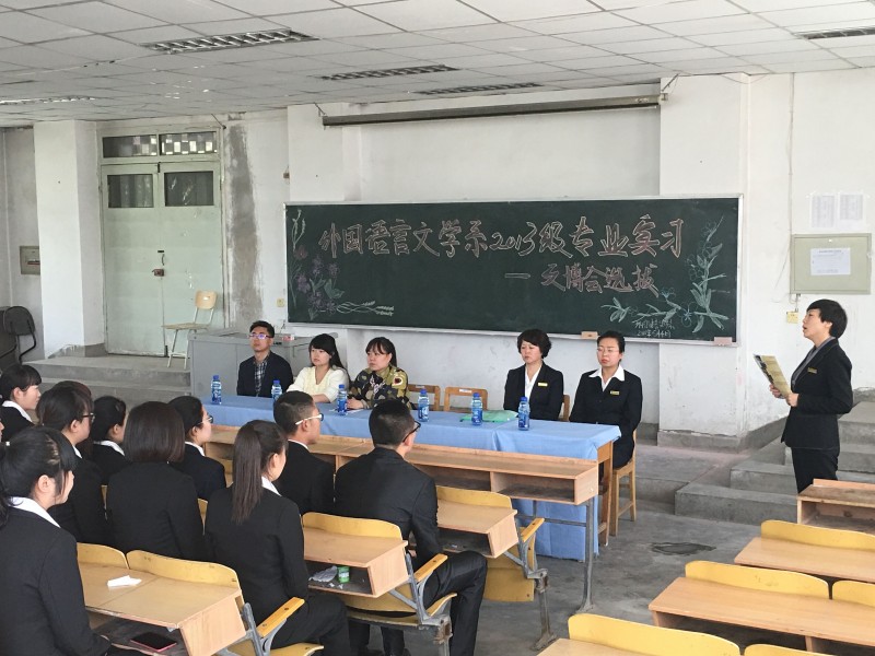 为在甘肃省即将举办的“一带一路”文博会选拔一批拥有优秀的语基础和素质能力较高的英语专业人才,宁卧庄宾馆、敦煌宾馆、敦煌国际大酒店人力资源培训部经理索惠兰、主管何青、主管李妙书在外国语言文学系领导的全力配合下,于2016年5月4日下午16:30二号楼115教室举行了文博会专业人才选拔会。参加本次选拔会的校内人员有陇桥学院就业指导中心赵德龙老师、外国语言文学系党总支书记周海燕老师,团总支书记蔡婧婧老师以及外国语言文学系2013级参与面试学生。 首先,在场的外国语言文学系面试学生对此次莅临我系的招聘单位表示热烈的欢迎。宁卧庄宾馆、敦煌宾馆和敦煌国际大酒店的招聘负责人索经理以微电影的形式向同学们详细的呈现了实习单位的工作理念、工作环境、工作条件并对实习学生的工作生活环境及薪资待遇做了保证。在这个过程中,同学们对实习单位的实际情况有了基本的了解和掌握。宁卧庄宾馆素有甘肃省国宾馆之称,承担着接待党和国家机关各部委、各省市来甘考察工作的团体、会议及省内重要会议和大型活动的接待服务工作。对于此次参与文博会的召开也非常重视。鉴于对我校学生综合素质的了解,特来选拔一批专业素质高的人员。索经理对想要进入这三个单位的学生们需要具备哪些硬性条件和素质提出了明确的要求,并对参加面试的学生进行了简单的面试。通过面试选拔之后,我系姚宏璐等三十一名学生首次面试成功。 本次会议为外国语言文学系2013届学生的提供了可以施展才能的实习机会,在恭喜被录取学生的同时,也期待这些同学能在自己的实习单位能以最优异的表现取得最优异的成绩。希望在以后的学习生活中每位同学放宽眼界,及时地与学校领导、系领导保持紧密的沟通与交流,并在自身专业度上能更好的提升自己,抓住机遇,为将来的实习就业提供更好的契机。
